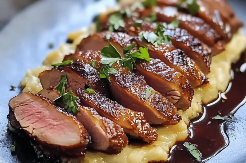 - Présentation impressionnante : Magret de canard joliment saisi avec un glaçage brillant au caramel et gingembre.