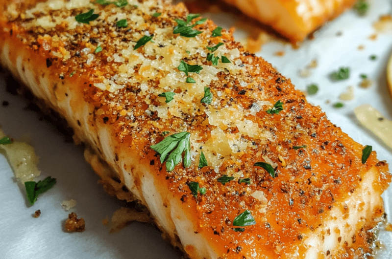 Imaginez servir un saumon parfaitement cuit, recouvert d’une croûte au parmesan croustillante, lors de votre prochain dîner avec des amis ou en famille. La croûte ajoute une texture irrésistible qui contraste agréablement avec la tendreté du saumon, tandis que le parmesan apporte une saveur riche et savoureuse, presque umami. Les épices que l’on ajoute à la croûte infusent le saumon d’une chaleur et d’une profondeur supplémentaires, elevant ce plat à un niveau supérieur.
